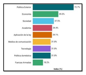 Para evaluar a través de indicadores empíricos la intensificación de esta relación a partir del TLC, resulta ilustrativo el China Index como mecanismo para medir la influencia china de manera multisectorial en el país. En el caso de Ecuador, los resultados demuestran una escalada porcentual contundente entre 2022 y 2024 especialmente en política exterior y economía (ver gráfico 1). Este alineamiento, destaca un aumento sostenido de a presencia e incidencia china en el país, llevándolo a ubicarse en el puesto 15 de 101 países relacionados. Esto, incrementa a su vez la posición del país como objeto de vulnerabilidad a la permeación de los intereses de la RPC en ámbitos políticos e incluso corporativos por la magnitud de dependencia económica o la recepción de beneficios.